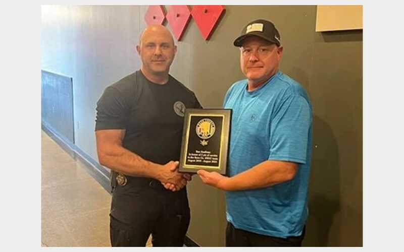 HUTCHINSON, Kan. — Captain Ron Kaufman was recognized on Aug. 22 for completing his 5-year service commitment as a SWAT Medic. Captain Kaufman was part of a small group of firefighters that took on the challenge of cross training with the Reno County SWAT team. This small group initiated what is now Hutchinson Fire TEMS (Tactical Emergency Medical Service).