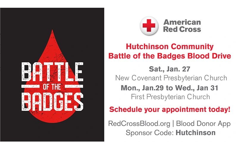 During the annual Battle of the Badges Blood Drive, the Hutchinson Fire and Police departments compete to see who can recruit the most blood donors. Everyone who comes to give can cast a vote to determine who will win this year’s bragging rights to the trophy. All those who come to donate during the Battle of the Badges Blood Drive will receive a commemorative T-shirt, while supplies last. Chicken and noodles will be served daily and cinnamon rolls on Wednesday morning.