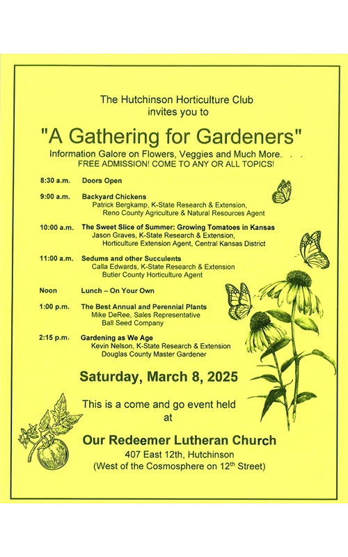 HUTCHINSON, Kan. — A day filled with free gardening information for homeowners and gardeners has been scheduled for Saturday, March 8. The Hutchinson Horticulture Club organizes and sponsors this event as their educational project for the community. It will be held at Our Redeemer Lutheran Church at 407 East 12th just west of the Cosmosphere. After missing two years because of Covid, the Club resumed having this annual event in 2023. If not for those Covid years, this would be the 36th year for this event.