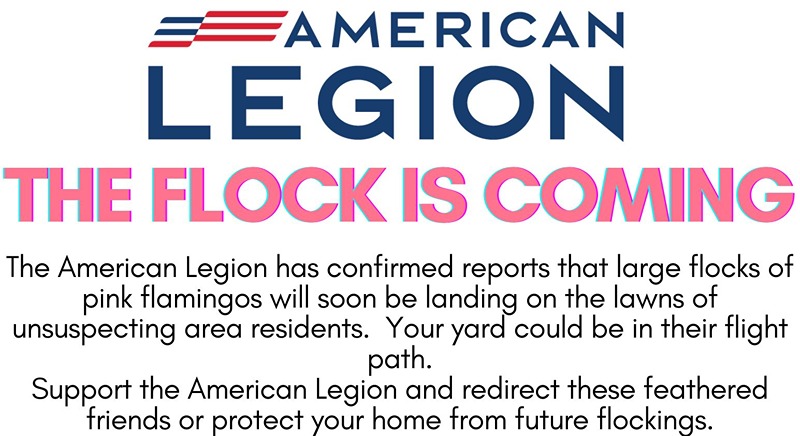 To arrange for a flocking, flocking insurance, or flocking removal, call or text (620) 509-7528. Forms can also be found on the American Legion Post 128 Facebook page.