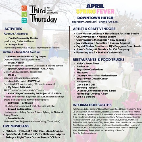 HUTCHINSON, Kan. – Cure that Spring Fever by going outdoors at April’s Third Thursday, Thursday, April 20th.