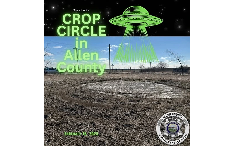 In Allen County this occurred in the area of 5000 Street and North Dakota Road east of Moran. The Allen County Sheriff’s Office said the vandalism, which cut deeply into a field as shown on a photo it posted Sunday afternoon, resembled a crop circle. It was not as neat as a real one though.
