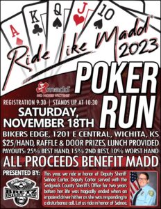 HUTCHINSON, Kan. — Bretz Injury Law is excited to present the 2023 Ride Like MADD Poker Run happening in Wichita, KS on Saturday, November 18th. Registration will begin at 9:30 a.m. with engines starting at 10:30 a.m.. The Poker Run will begin at Bikers Edge Powersports, 1201 E Central, Wichita, KS. Poker run stops include Cycle Gear, Jay Hatfield Honda Powerhouse, Savage Cycles, Freedom Road Cycles, and Twister City Harley-Davidson. The entry fee is $25/hand and $10 for each additional hand with donations also being accepted. All vehicles are welcome to participate.