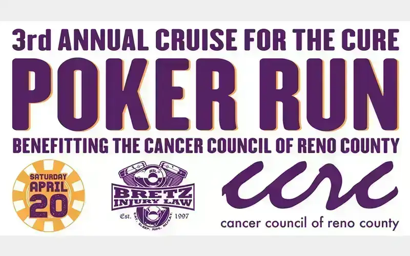 Bretz Injury Law is excited to announce the 3rd Annual Cruise for the Cure Poker Run occurring in Hutchinson, KS on Saturday, April 20th. Registration will begin at 9:30 a.m. with engines starting at 10:30 a.m. The Poker Run will start at Salty Cycles, 129 E Sherman, Hutchinson, KS. Poker Run stops include Buhler Gas Co., Miller Cycle Shop in Inman, Nickerson Community Center, Great Plains Motorsports in South Hutchinson, and Bretz Injury Law in Hutchinson. The entry fee is $25/hand or $50 for three hands. Donations to the Cancer Council of Reno County will be accepted.
