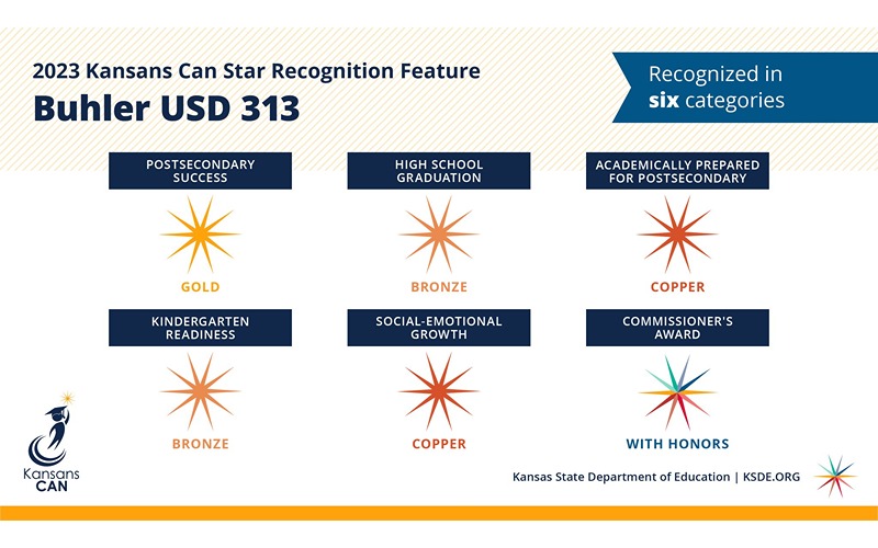 BUHLER, Kan. — Kansas State Department of Education announced on Thursday, Dec. 7 that Buhler USD 313 Earned achievements in six Kansans Can Star Recognition outcome areas, including a gold star in Postsecondary Success and a Commissioner’s Award with Honors.