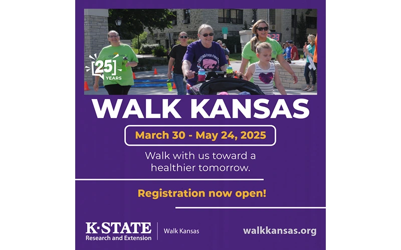 Dust off those walking shoes and join the fun and challenge of Walk Kansas, running March 30th -May 24th! This is a team-based program that will inspire you to lead a healthier life by being more active, making better nutrition choices, and learning positive ways to deal with stress. During the 8 weeks, you will log and report minutes of physical activity and the amount of fruits and vegetables you eat.