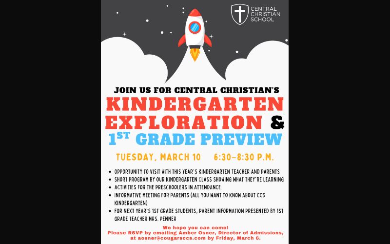 Families interested in attending Central’s Kindergarten Exploration and First Grade Preview can RSVP by clicking here, calling (620) 663-2174, or emailing [email protected]. Details about Central Christian can also be found on their website, www.cougarsccs.com.