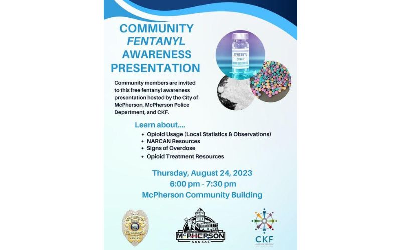 McPHERSON, Kan. — Members of the community are invited to a free fentanyl awareness presentation on August 24 from 6 p.m. to 7:30 p.m. at the McPherson Community Building located at 122 E. Marlin Street. The event will be hosted by the City of McPherson, the McPherson Police Department, and CKF Addiction Treatment.