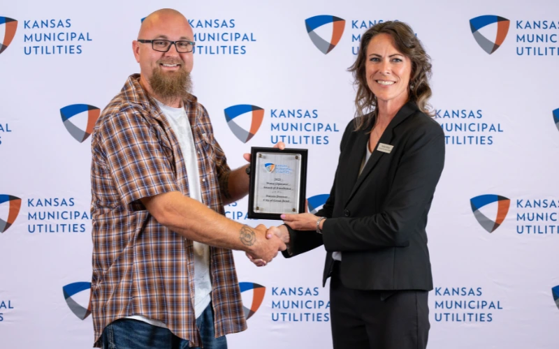 GREAT BEND, Kan. — Darren Doonan, Utilities Supervisor for Great Bend, Kansas, was presented with the 2025 Water Operator Award of Excellence by Kansas Municipal Utilities (KMU). KMU is the statewide association of community-owned and operated electric, gas, water, and wastewater utilities in Kansas. Doonan was presented the award at the 2025 KMU Conference in Wichita on April 24, 2025, by Katie Miller, KMU Director of Water Services.