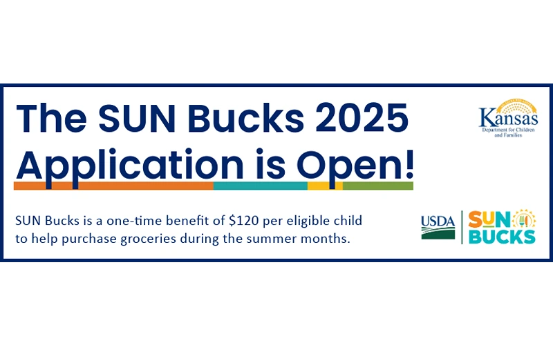TOPEKA, Kan. — The Kansas Department for Children and Families (DCF) announced Monday, Jan. 27 that the 2025 application period for SUN Bucks is now open. SUN Bucks, previously called Summer EBT in Kansas, is a federal program administered by DCF that provides a one-time benefit of $120 per year for each eligible school-aged child to help offset the cost of groceries over the summer.