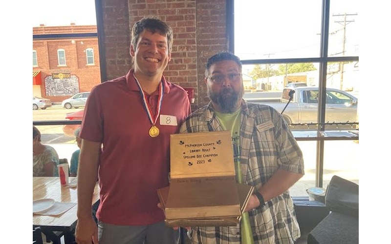 With King’s victory, the Moundridge Public Library will get a traveling trophy to keep for the next year and will receive a portion of Friday nights’ proceeds from the Hub. The inaugural Adult Spelling Bee drew a large audience to Moundridge for the finals.