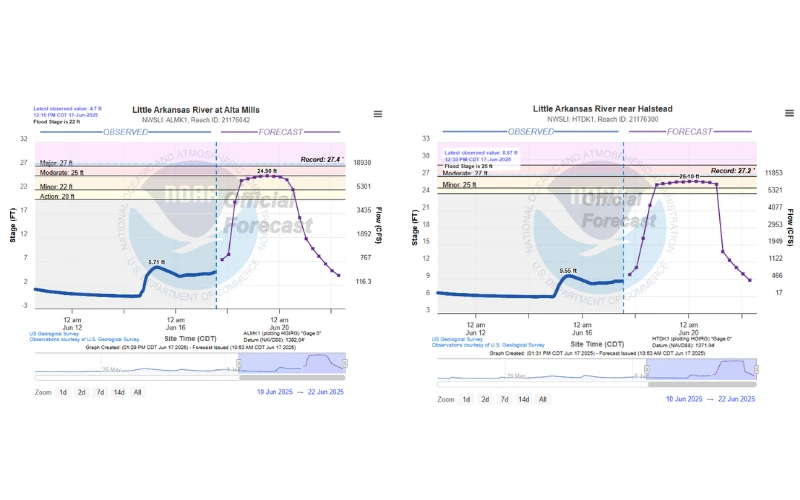 At Alta Mills the Little Arkansas will rise above the 22 feet flood stage Wednesday afternoon and crest at 24.2 feet early Thursday morning.