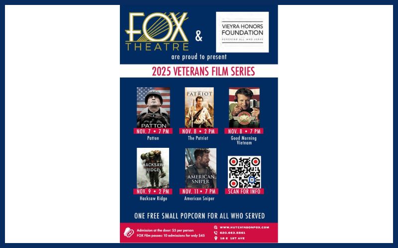 HUTCHINSON, Kan. — Hutchinson’s Historic Fox Theatre is proud to honor all veterans with a special Veterans Film Series, sponsored by the Vieyra Honors Foundation. Veterans and service members attending the series will receive one small free popcorn as a small token of appreciation for their service.