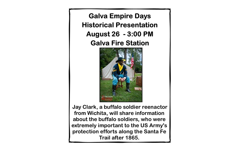 A big event happening on Saturday will be the Buffalo presentation at 3 p.m. at the Galva Fire Station. Jay Clark, a buffalo soldier reenactor from Wichita will be sharing about the buffalo soldiers’ impact on the protection of the US Army along the Santa Fe Trail after 1865.