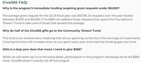 With the change, this means that the program will no longer have any time commitments, such as committee meetings or application reviews. Just donate $365 to the Give365 fund and the foundation will take care of the rest!
