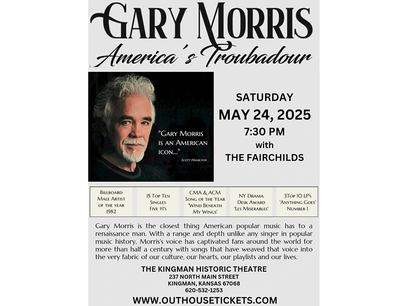KINGMAN, Kan. — Country legend Gary Morris is performing a concert at The Kingman Historic Theatre on Saturday, May 24 at 7:30 p.m.