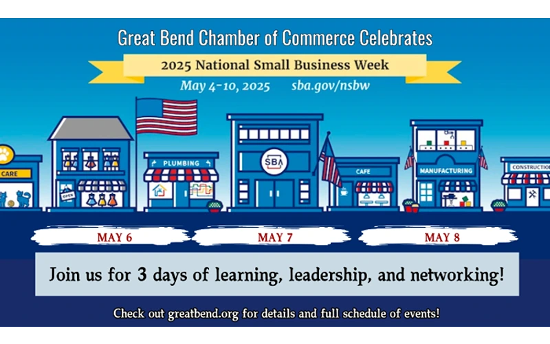 The Great Bend Chamber of Commerce is partnering with the U.S. Small Business Administration and SCORE, mentors to America’s small businesses and an SBA resource partner, to present the 2025 National Small Business Week virtual summit. The free two-day online event will take place May 6 and 7 from 9 a.m. to 5 p.m. CT. Registration is required to attend online, but the chamber will have an in-person option in the chamber board room for your convenience.