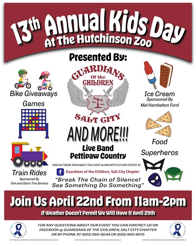 HUTCHINSON, Kan. – Guardians of the Children Salt City has announced its 13th annual Kids Day at the Hutchinson Zoo on Saturday, April 22nd. Weather permitting, events will take place from 11 a.m. to 2 p.m.
