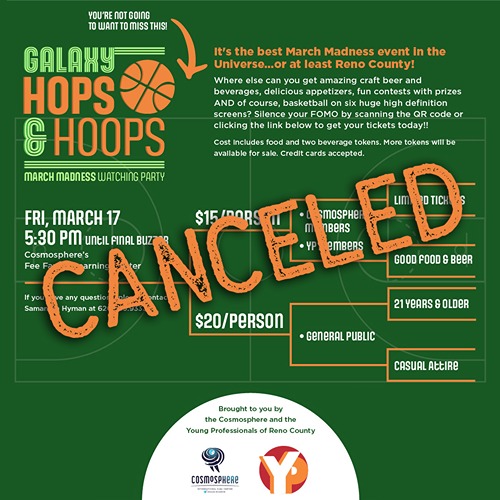 HUTCHINSON, Kan. – Galaxy Hops and Hoops, scheduled for Friday, March 17 at the Cosmosphere has been canceled due to low ticket sales.