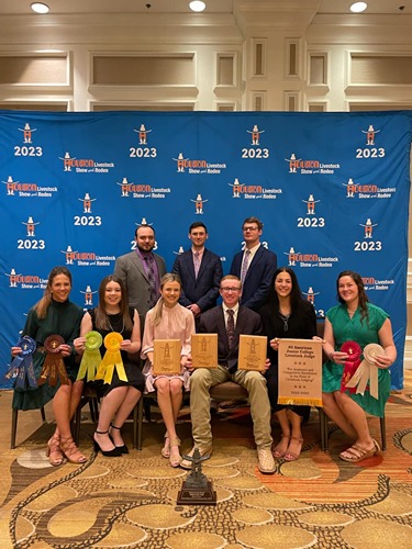 Houston Photo: Front Row (L to R) Emma Balisky, Grande Prairie, Alberta; Ashlyn Robinson, North Platte, NE; Lindsey Lehman, Mt. Vernon, IL; Emmitt Meyring, Jelm, WY; Bridget Weller, Zeeland, MI; and Makayla Talley, Craigsville, VA. Back Row (L to R) Kane Austin, Livestock Judging Coach and Agriculture Instructor; Guy Wright; Ignacio, CO; and Dillon Knepp, Lincolnville, KS.