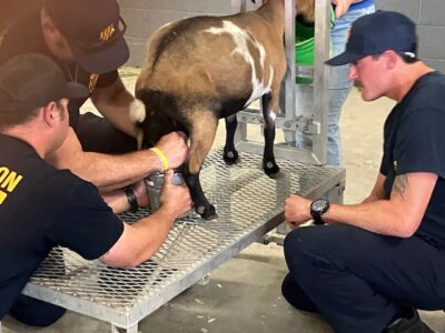 HUTCHINSON, Kan. — The Golden Goat will be in possession of the Hutchinson Fire Department for the next year. A three-member team from the department won the Kansas State Fair’s Celebrity Goat Milking Contest this year, edging out a three-member State Fair Board team in the final round of the contest where each member milked the goat for 15 seconds then switched off to another team member.