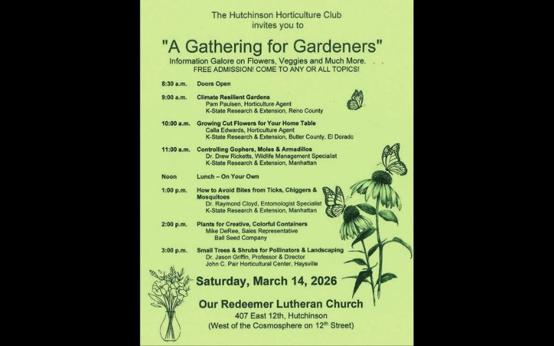 HUTCHINSON, Kan. — A day filled with free gardening information for homeowners and gardeners has been scheduled for Saturday, March 14th. The Hutchinson Horticulture Club organizes and sponsors this event as their educational project for the community. It will be held at Our Redeemer Lutheran Church at 407 East 12th just west of the Cosmosphere. After missing two years because of Covid, the Club resumed having this annual event in 2023. If not for those Covid years, this would be the 37th year for this event.