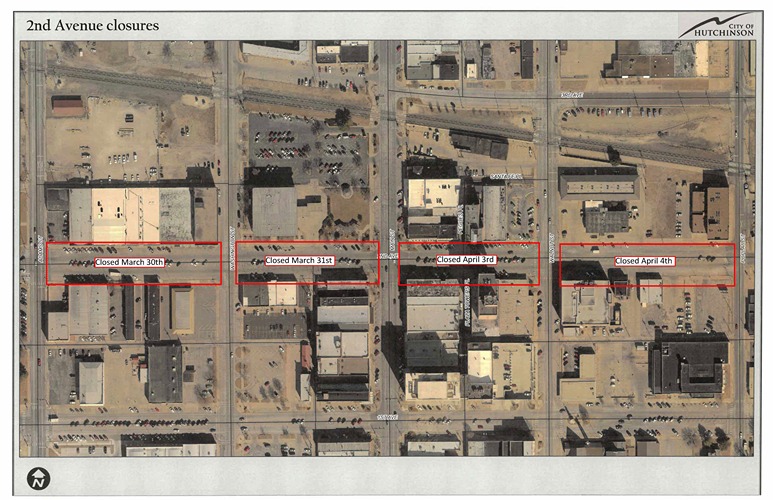 HUTCHINSON, Kan. – 2nd Avenue between Adams Street and Poplar Street will be closed to traffic in increments beginning on Thursday, March 30th.