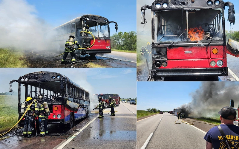 According to McPherson Fire Department, they responded to mile marker 68 on I-135 shortly before 1 p.m. to assist Lindsborg Fire Department with the fire. The 29 occupants of the bus had evacuated the bus when the fire was detected. The fire department shared that Southbound I-135 traffic was reduced to one lane while the incident was mitigated. McPherson Fire responded with 4 Apparatus and 9 personnel. McPherson County Sheriff Deputies and the Kansas Highway Patrol were on the scene as well.