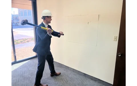 Following Monday’s meeting, Commissioners and representatives of Fuqua took park in a “wall smashing” ceremony to formally kick off the $6.7 million renovation project, on the conclusion of which most county departments now housed in the Courthouse will be relocated to the County Building on the northeast corner of Maple and Marlin.