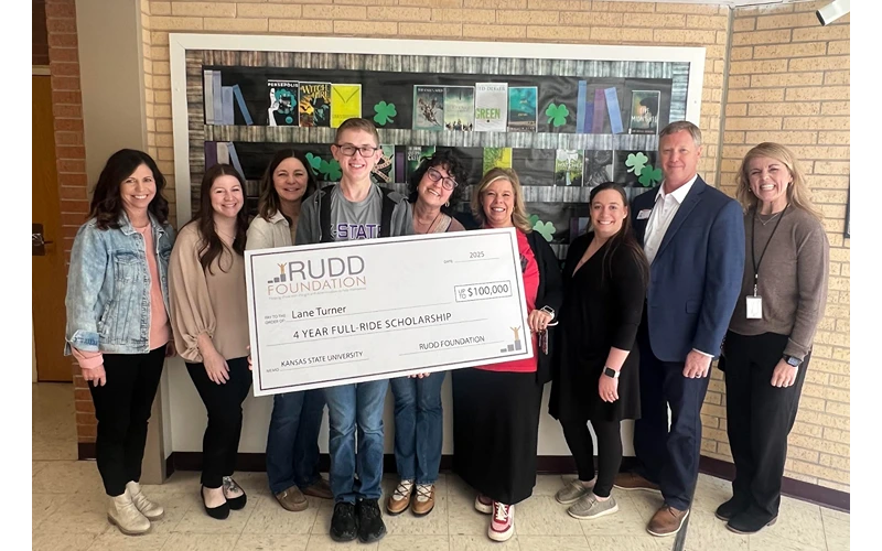 McPHERSON, Kan. — McPherson High School senior Lane Turner and his parents were surprised by Rudd Foundation representatives Monday, as they presented Lane with a $100,000 scholarship and a full 4-year ride to Kansas State University.