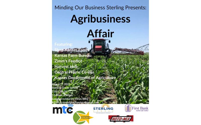 STERLING, Kan. — On Aug. 1, from 11-2 at Sterling Grade School, an Agribusiness Affair, presented by Minding Our Business Sterling will feature information on Shop Kansas Farms, Kansas Farm Bureau, Zimm’s Feedlot, Harvest Hub, Central Prairie Coop, and the Kansas Department of Agriculture. Lunch will be served, and RSVP’s can be made by emailing [email protected].