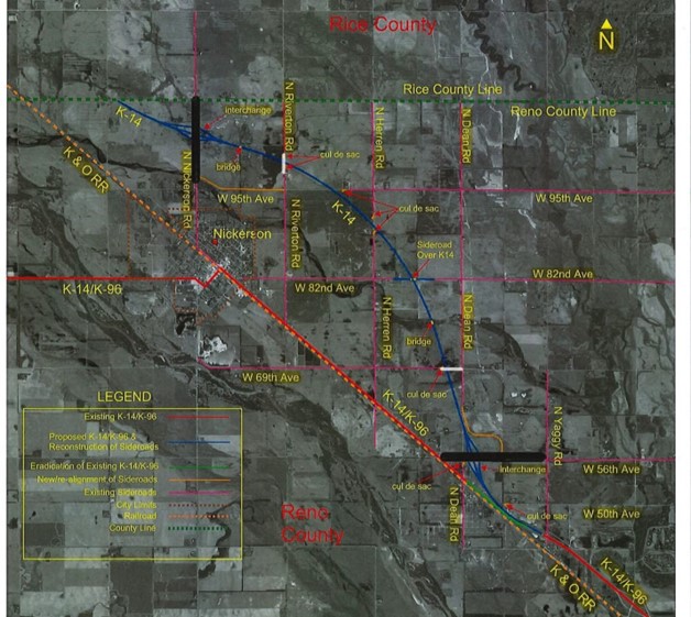 During the work, traffic will continue to use the existing K-14/96 alignment in Reno and Rice counties.