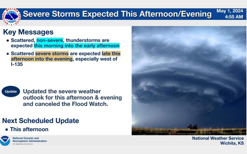 The National Weather Service (Wichita) shared an update for May 1, 2024, about severe weather expected for this afternoon into the evening.