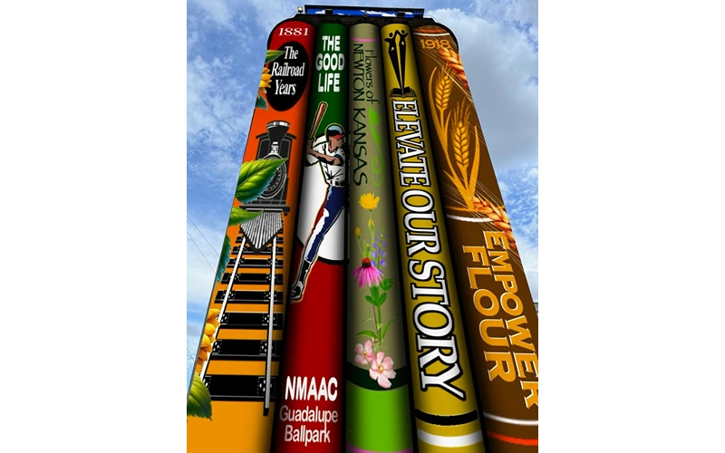 Greg Bontrager, associate director of the Newton Community Foundation, presented the concept design. The mural will cover the west end of Ardent Mills’ north elevator at Seventh and Pine streets, overlooking the new Newton Public Library. The 7,600-square-foot mural will highlight elements of Newton’s history and culture reflected in books on a shelf, flanked by sunflowers and wheat.