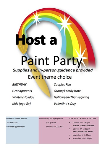 Artist, Irene Nielsen, of Main Greet Galleria, Lindsborg, is ready to receive guests for fun and personal creativity. Nielsen will guide a small group of guests through painting an original expression on canvas. All levels of talent and hesitation are accommodated to finish and take home a finished painting in 2 hours.