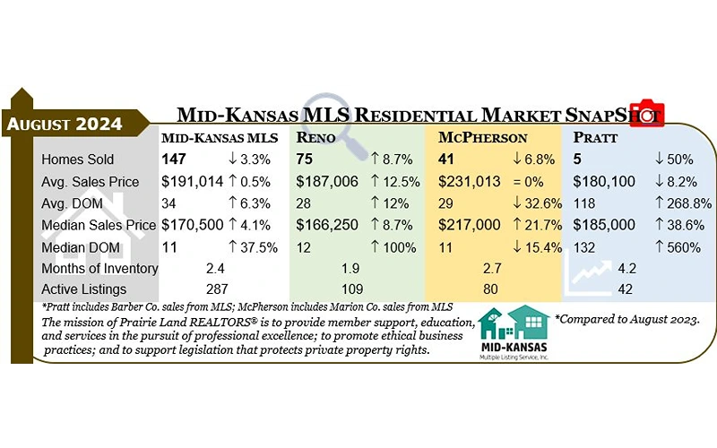 Area home sales during August through Prairie Land Realtors Mid-Kansas Multiple Listing Service were down 3.3% from a year ago, while median sales prices were up.