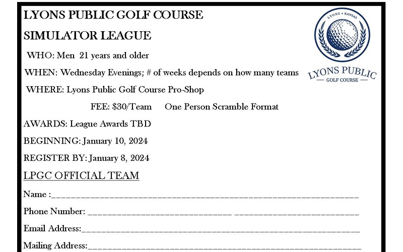 LYONS, Kan. — Registration has begun for the Lyons Public Golf Course Men’s Simulator League. The league will be a One-Person Scramble format. It begins on Jan. 10, and costs $30. Sign-up on or before Jan. 8 in the Pro-Shop.