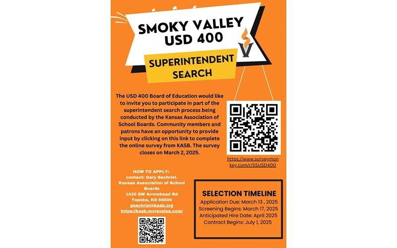 As part of the process, USD 400 is asking patrons and community members to provide input on what they would like to see in a new superintendent. The survey is online at www.surveymonkey.com/r/SSUSD400. There’s also a QR code to that survey on the Smoky Valley USD 400 Facebook page.