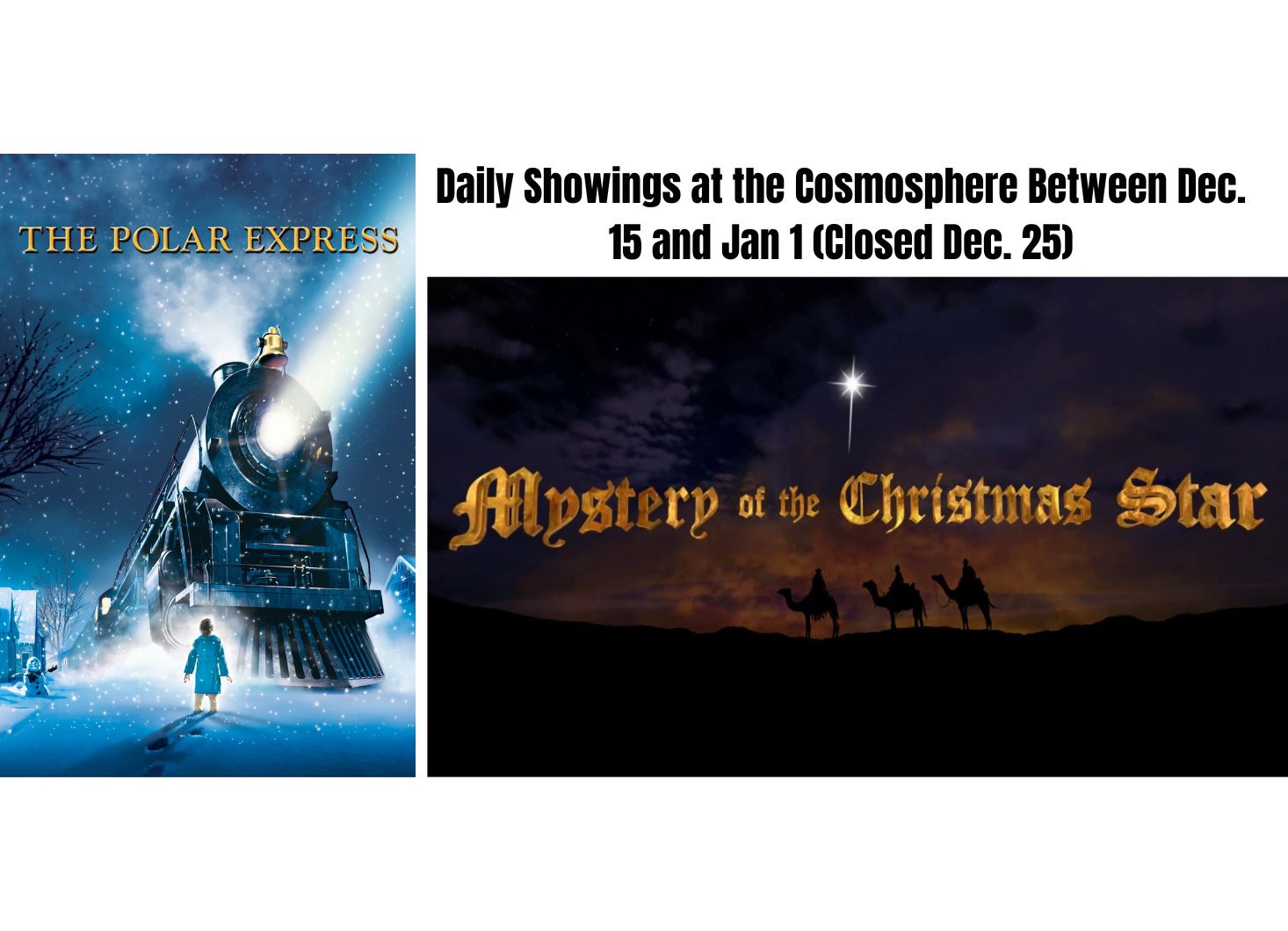 December 15, 2023, through January 1, 2024, Cosmosphere is open from 9 a.m. to 7 p.m. seven days a week, with the exception of December 24 when the Cosmosphere closes early at 3 p.m. and December 25, when the Cosmosphere will close for Christmas.