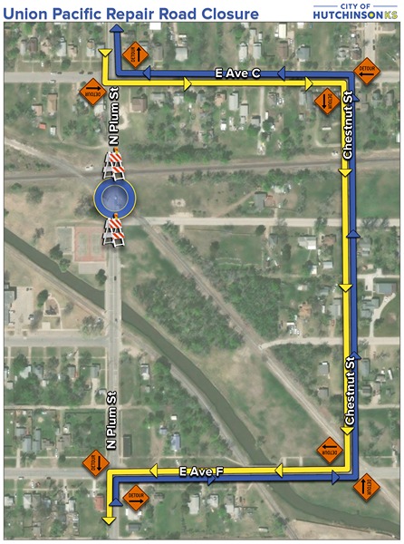 HUTCHINSON, Kan. – [April 6, 2026]- Union Pacific Railroad has notified the City of Hutchinson of upcoming railroad crossing closures that will affect traffic at multiple locations just north of Avenue D.