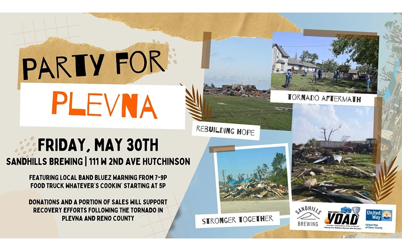 In support of Plevna area residents impacted by the tornado, Sandhills Brewing at 111 West 2nd in Downtown Hutchinson is hosting a fundraiser, “Party for Plevna” Friday evening from 5-10 PM.