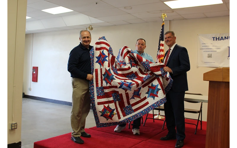Croft was presented with a Patriotic Quilt from the Kansas State Fair Board. He is pictured with Deputy Director of Kansas Office of Veterans Services and Kansas State Fair General Manager Bryan Shulz.