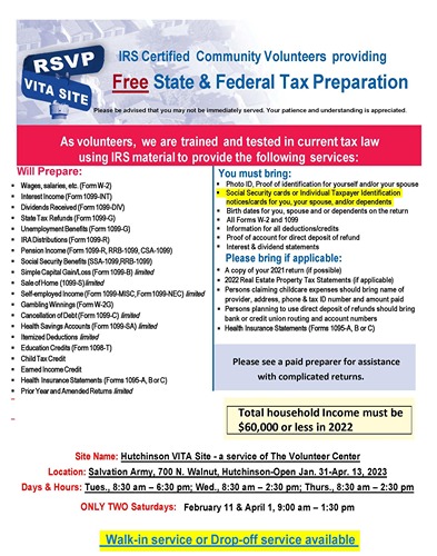 HUTCHINSON, Kan. The Volunteer Center of Reno County’s Volunteer Income Tax Assistance site, located inside the Salvation Army, 700 N. Walnut St., will be open Tuesday, January 31st through Thursday, April 13th. Assistance will be available on Tuesdays, Wednesdays, and Thursdays from 8:30 a.m. until 2:30 p.m., as well as on two Saturdays, February 11th and April 1st from 9 a.m. until 1:30 p.m.