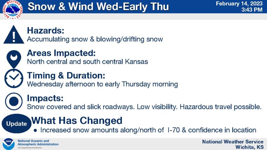 (NWS) – A storm system will bring accumulating snow to the region Tuesday afternoon through early Thursday morning. Gusty north winds will cause blowing and drifting of snow along with reduced visibilities mainly over central Kansas. Impacts to travel are expected across north central Kansas.