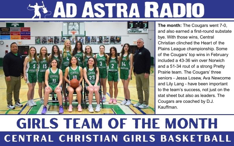 Each month, Ad Astra Radio recognizes a girls and boys Team of the Month, selected from area high schools. The Girls Team of the Month for February goes to Hutchinson-Central Christian Girls Basketball.