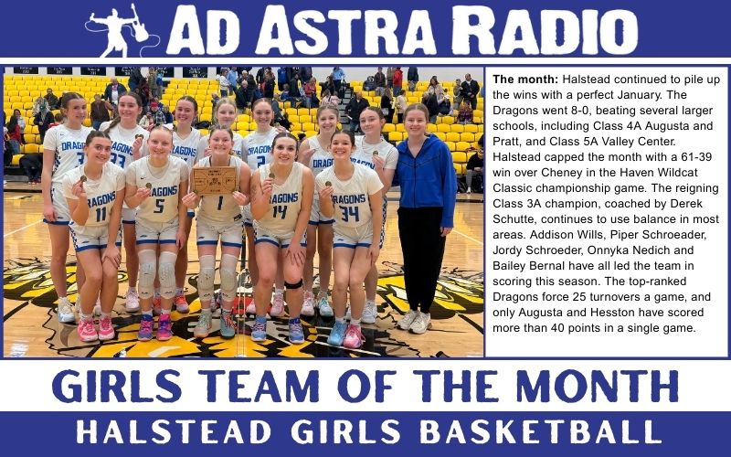 Each month, Ad Astra Radio recognizes a girls and boys Team of the Month, selected from area high schools. The Girls Team of the Month for January goes to the Halstead Girls Basketball team.