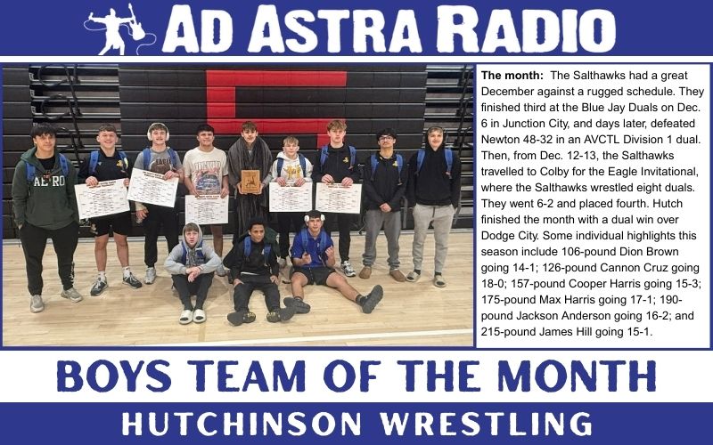 Each month, Ad Astra Radio is recognizing a girls and boys Team of the Month from area high schools. The Boys Team of the Month for December goes to Hutchinson Wrestling!