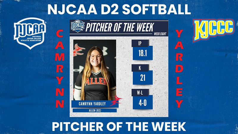 COLBY, Kan. (KJCCC.org) – After being named Kansas Jayhawk Community College Conference Division 2 Softball Pitcher of the Week on Tuesday, Allen Community College sophomore Camrynn Yardley has been named NJCAA Division 2 Softball Pitcher of the Week to become the third KJCCC Division 2 Softball Player to earn NJCAA accolades this season.
