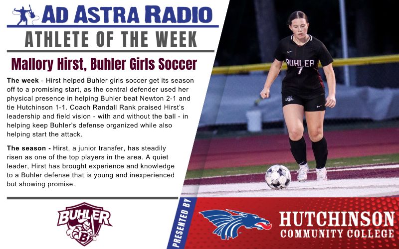 Ad Astra Radio is proud to announce Buhler High School junior Mallory Hirst as this week’s Athlete of the Week, presented by Hutchinson Community College.
