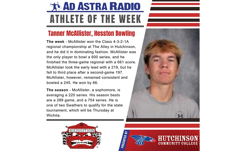 HESSTON, Kan. — Congratulations to Hesston High School sophomore Tanner McAllister, Ad Astra Radio’s Athlete of the Week, presented by Hutchinson Community College.